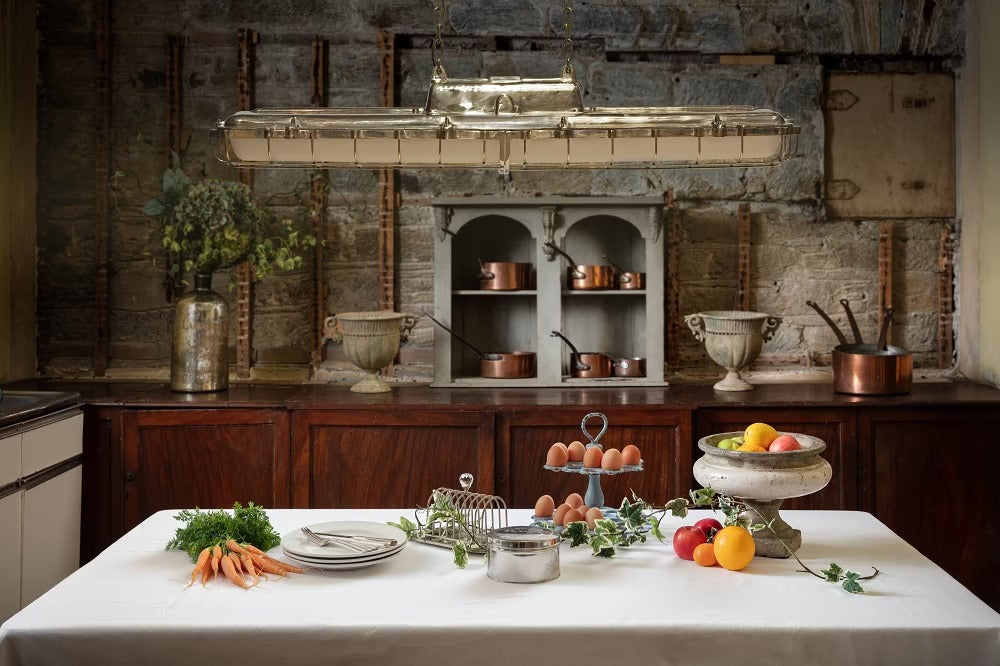 The solid brass Warwick Pendant by Soho Lighting offers bold industrial elegance with polished or antique finishes. Its striking form, paired with a 3-metre chain, makes a powerful statement while casting bright, beautiful light over kitchen islands and dining spaces.